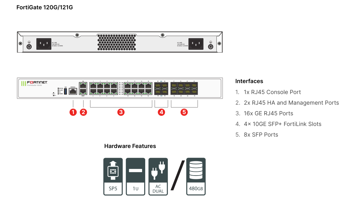 18个GE RJ45端口(包括1个MGMT端口、1个HA端口、16个交换机端口)、8个GE SFP插槽、4个10GE SFP+插槽、SP5硬件加速、480GB板载SSD存储(限FG-121G)、双交流电源。