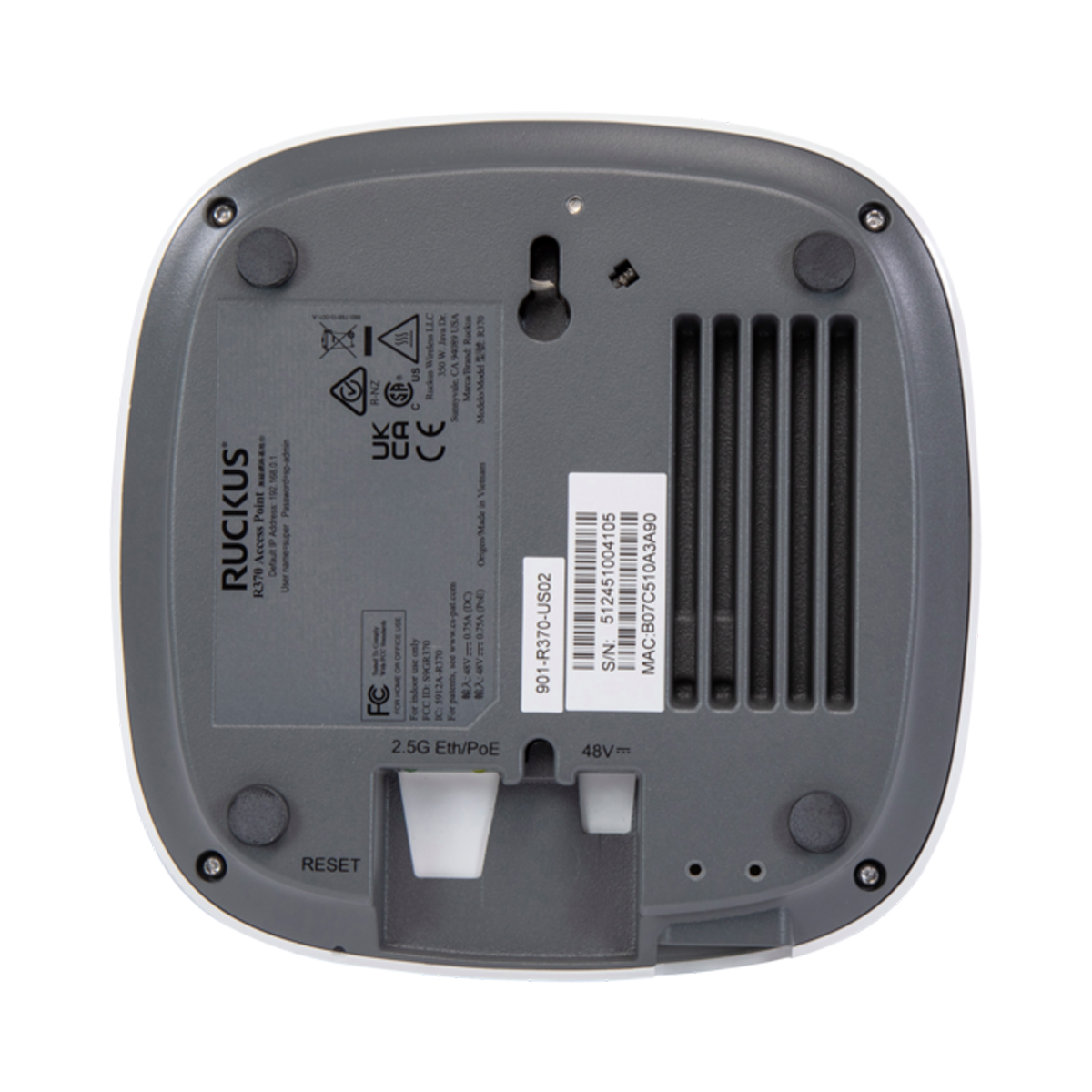 RUKCUS® R370 Wi-Fi 7、物联网就绪室内接入点可提供 802.11be 无线连接,并结合所有 RUCKUS 专利技术,实现性能优化和干扰缓解,让您无需破坏银行。