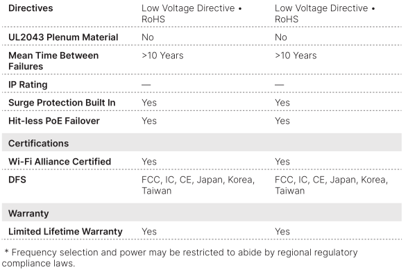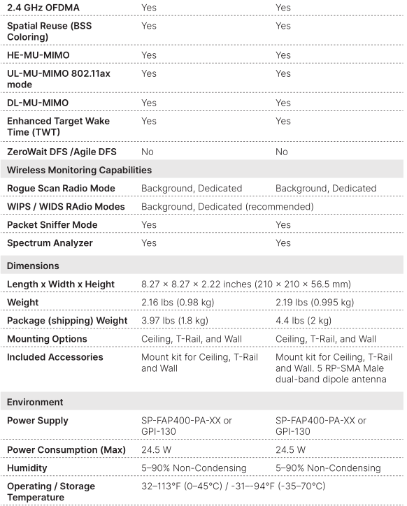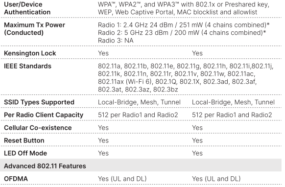 These enterprise class 802.11ax indoor APs provide three radios. These top-of-the-line access points provide OFDMA, a 2.5 Gigabit Ethernet port, plus an additional1 Gbps Ethernet port for PoE diversity. The APs can provide 24/7 scanning acrossboth bands while still providing access on both the 2.4 and 5 GHz bands. The integrated BLE radio can be used for beacons and locationing applications.