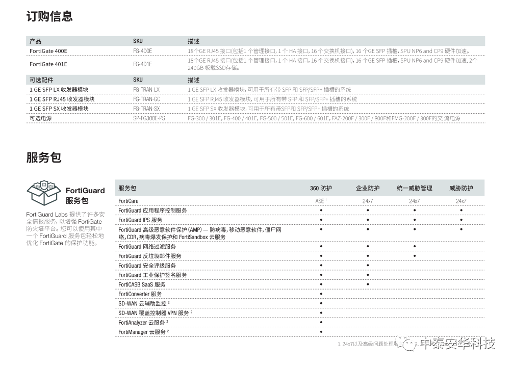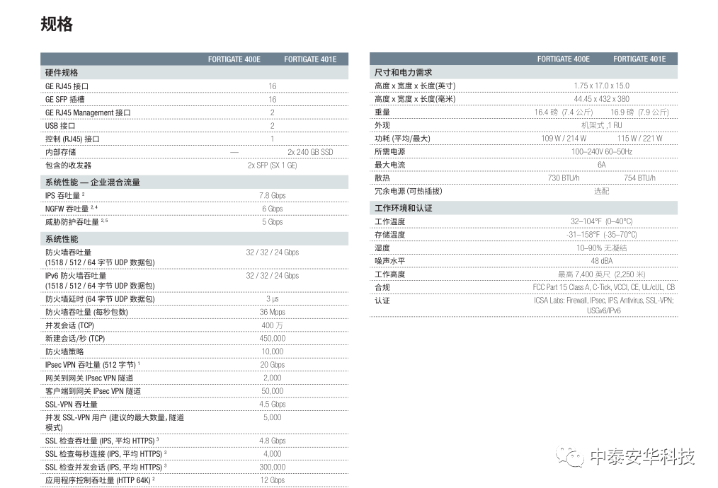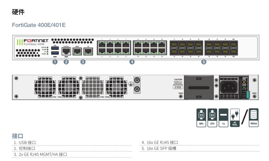 18个GE RJ45端口(包括1个MGMT端口、1个HA端口、16个交换机端口)、16个GE SFP插槽、SPU NP6和CP9硬件加速、2个240GB板载SSD存储(限FG-401E)