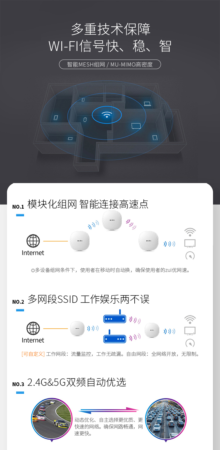 超高Wi-Fi 6(802.11ax)性能,双射频,绿色接入点能效。双射频4x4:4 802.11ax内置天线统一园区接入点